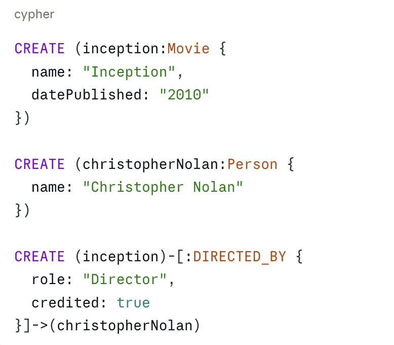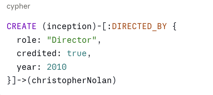 Nodes have labels and properties. Relationships are directed, typed, and can also have their own properties. The DIRECTED_BY relationship includes role and credited information. This is one of the most important differences from RDF.