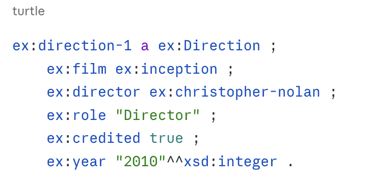 Here’s the situation that confuses teams switching from property graphs to RDF. You are modeling a directing relationship, not just “Christopher Nolan directed Inception” but with metadata: in what capacity, whether he was credited, and the year it was released.